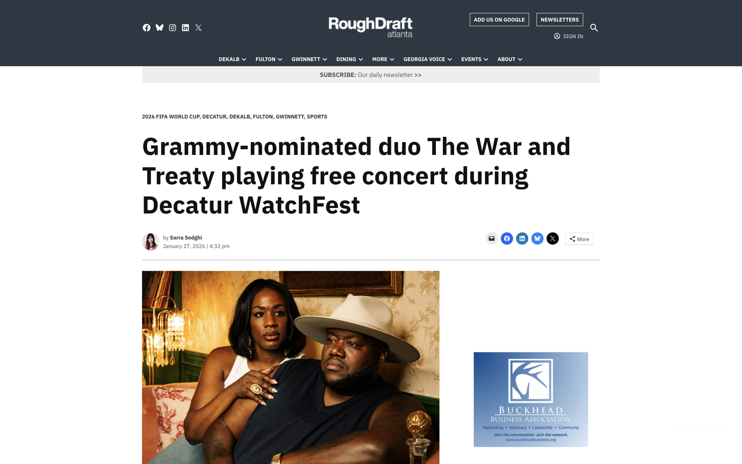 Grammy-nominated duo The War and Treaty playing free concert during Decatur WatchFest March 19, 2026 watchfestadmin Share This Twitter Facebook LinkedIn Email watchfestadmin Related Posts Decatur Set to Be the Ultimate FIFA World Cup 2026 Travel Hotspot! FIFA World Cup to Bring $142 Million to Decatur Decatur businesses poised for World Cup boost